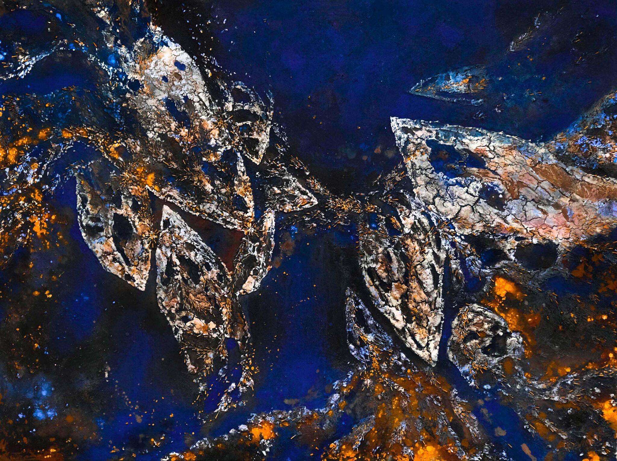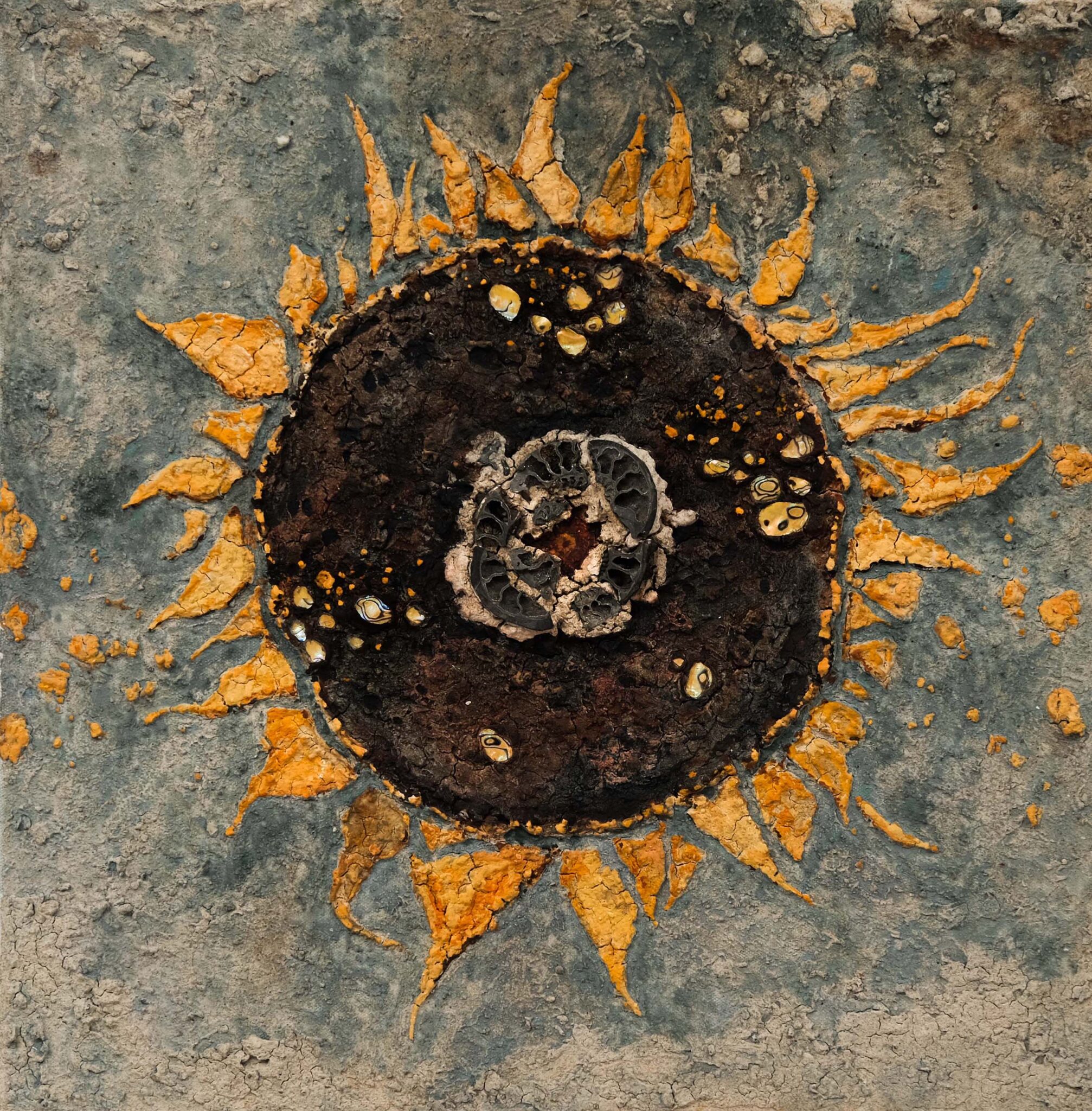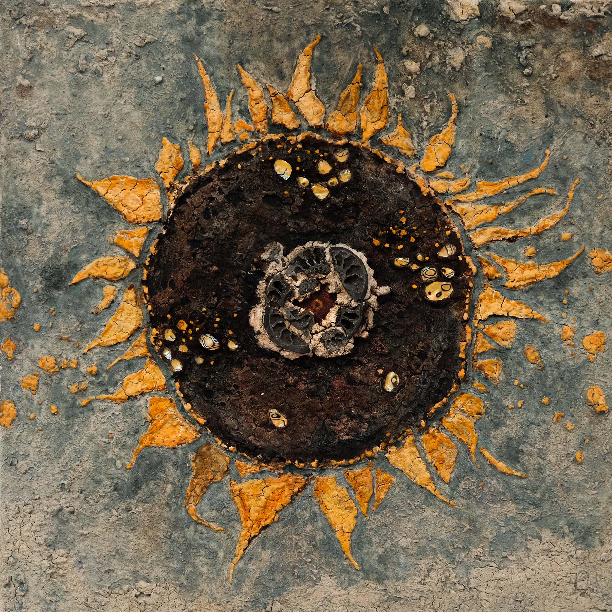 Material : Mixed media (mother-of-pearl, ammonite fossil, acrylic, chalk , plasters and clay) on canvas